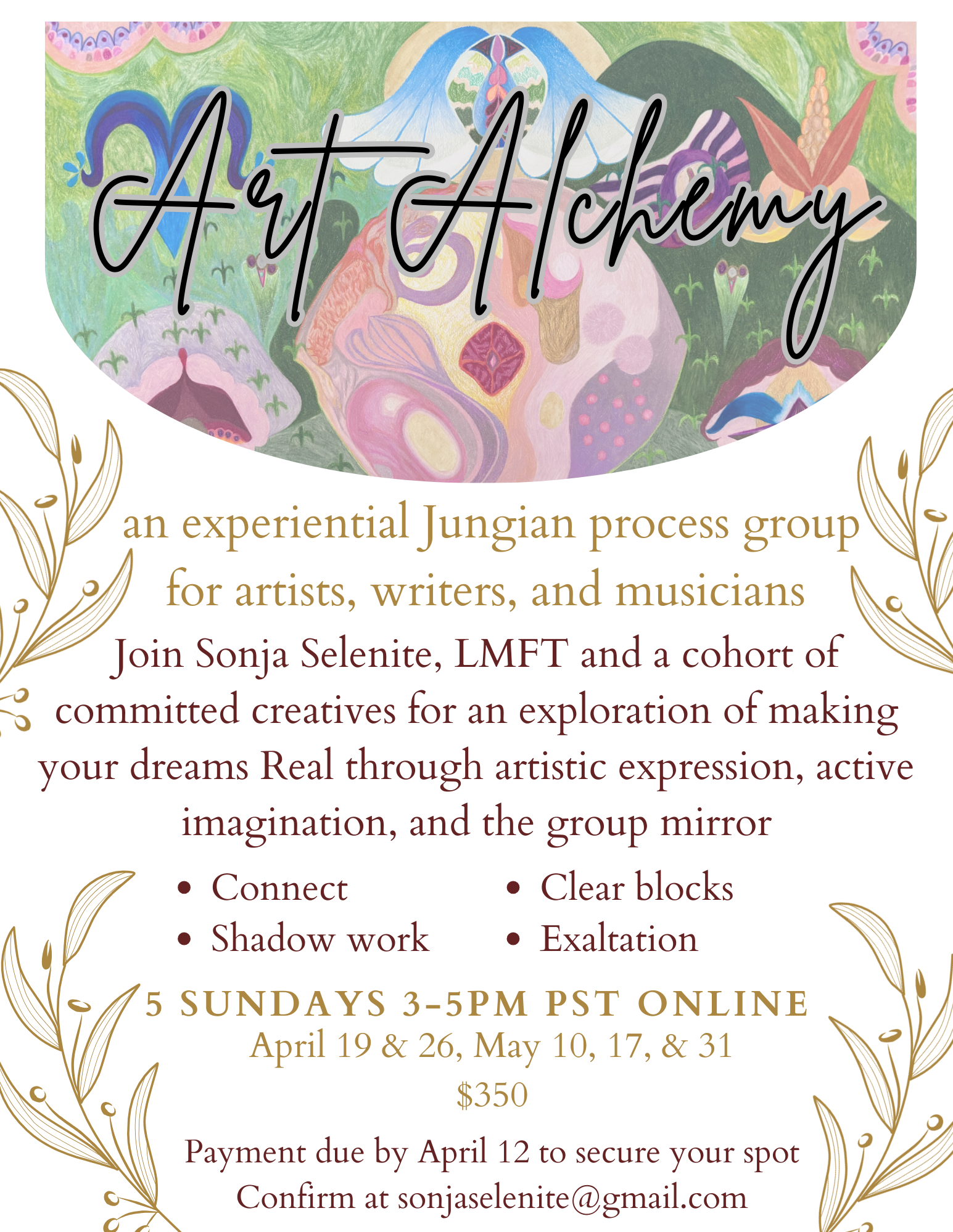 My next group cohort will begin Sunday, April 19th and lead you through an alchemical sequence designed to stimulate your creative juices! We will be discovering the relationship between shadow and creative blocks and begin to link up Intention and Ritual with your chosen craft.